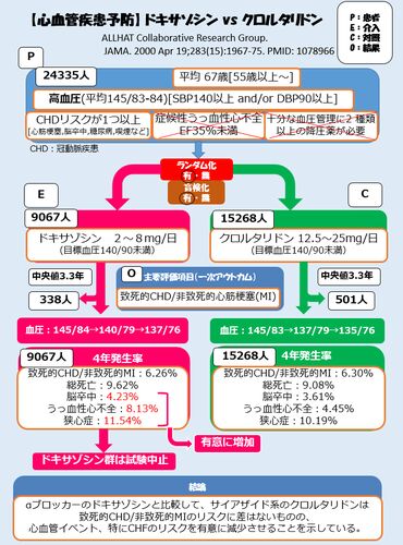 「『1日1論文、医学論文の活かし方』で取り上げられた論文をビジアブ化してみよう祭」の第2弾ということで、ALLHATを読んでみました。書籍で取り上げられたCaブロッカー、ACE阻害薬、利尿薬の比較ではなく、早期終了となったαブロッカー「ドキサゾシン」の…