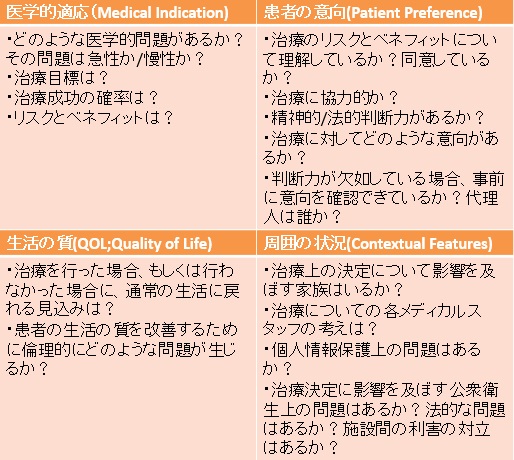 参考;Jonsen AR,Siegler M, Winslade WJ. Clinical Ethics:a Practical Approach to Ethical Decisions in Clinical Medicine. McGraw-Hill Education.