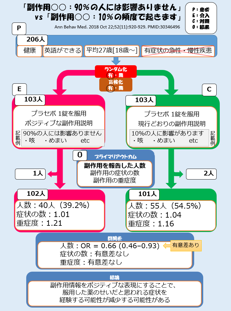 はかせ「そのとおり。その違いは、P922の右側『Intervention』にある。薬情はA4サイズに印刷して封筒に入れて参加者に渡したようだ。薬の名前は伏せられたため、効能効果などは伏字で消されている」