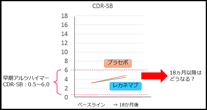 プラセボ群がどんどん高くなっていくなら、アミロイドの沈着量の差がますます開いて、臨床症状にも差がでるのかな?と思いましたが、プラセボ群はほぼ不変なんですよね。それなのに、プラセボ群のCDR-SBは悪化しています。そして、レカネマブ群はアミロイドを減らしたのに、やはりCDR-SBは悪化している(プラセボよりはゆるやかだけど)…。