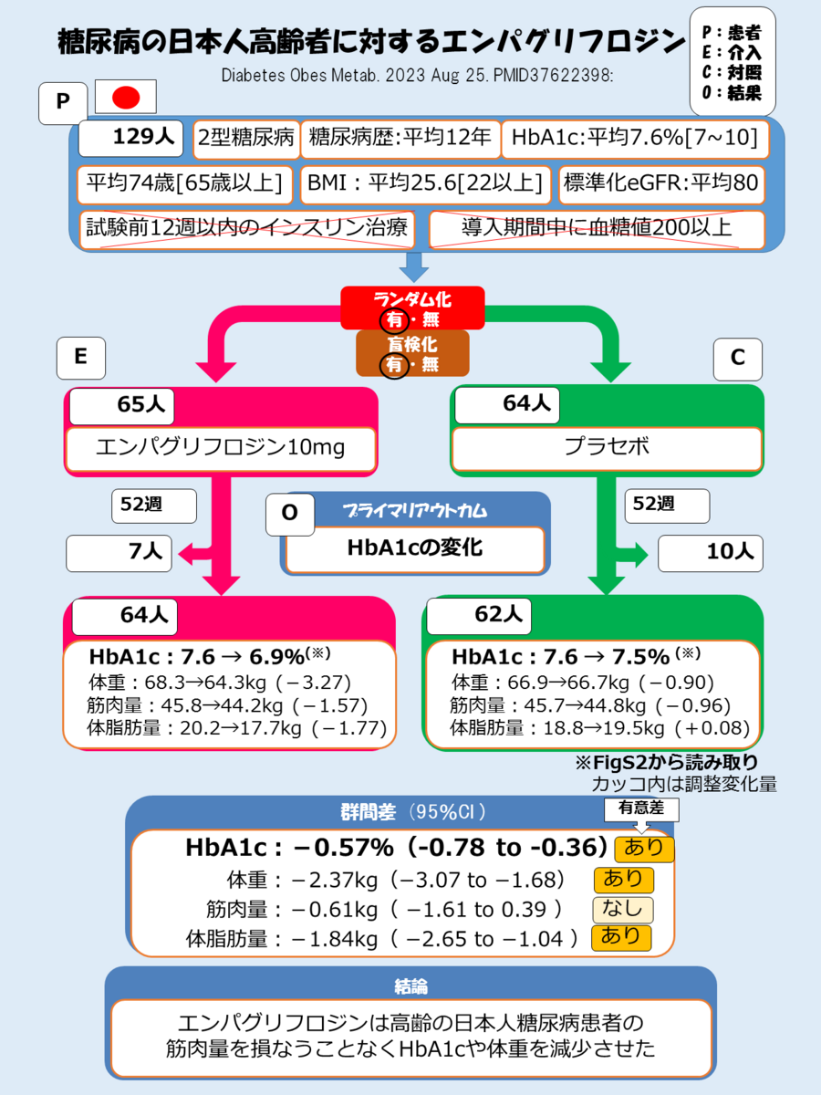 SGLT2阻害薬は尿糖としてグルコースを排泄し、体重を減少させますが、高齢者においては筋肉量減少にもつながってサルコペニアのリスクを高めるんじゃねーかっていう件について、日本人高齢糖尿病患者を対象としたプラセボ対照試験の結果が出ました。